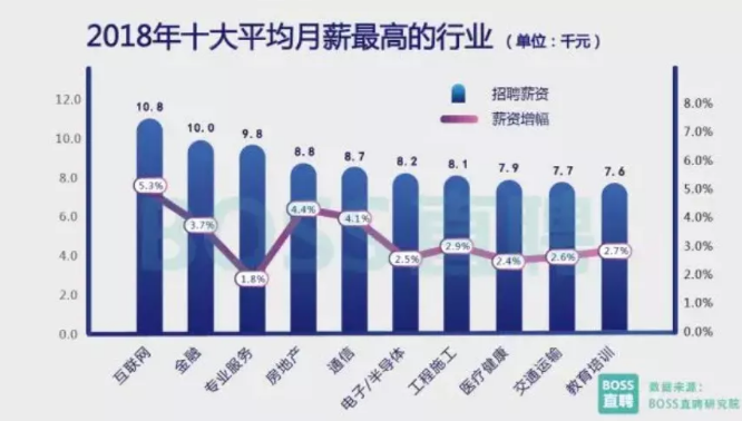 2018年就業互聯網行業平均月薪最高